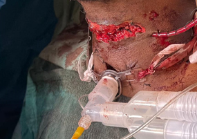 42/M Patient came with H/o self inflicted, cut throat Diagnosed -Self inflicted cut injury /zone-1 and 2 neck injury . Presented with severe bleeding, hypovolumic shock .Airway secured and fluids started . Pt was shifted to emergency OT and resuscitation started and stabilized by our anesthesia team. Patient underwent Emergency exploration of neck and bleeding IJV was ligated and ryles tube inserted .There were two penetrating wounds in neck , one in zone 1 which was exposed and Tracheostomy done. In zone 2, there was complete transection of thyroid cartilage and epiglottis, completely separated and tear went upto pyriform mucosa. Cartilage repair and mucosa repair done . It is first of its kind , cut throat injury with vessel bleed and pt revived in almost arrested stage and successfully surgical repair done .